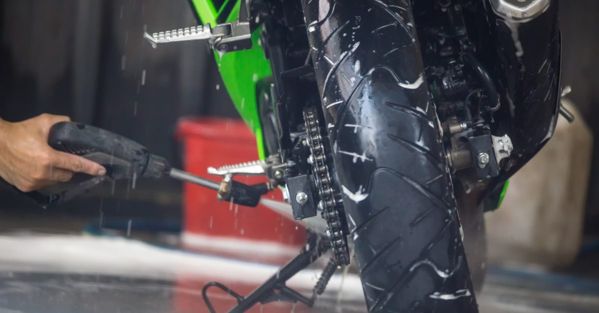 Тщательное ополаскивание. После того, как вы вымыли весь мотоцикл, тщательно смойте всю пену чистой водой. Убедитесь, что на поверхности не осталось никаких остатков моющего средства.